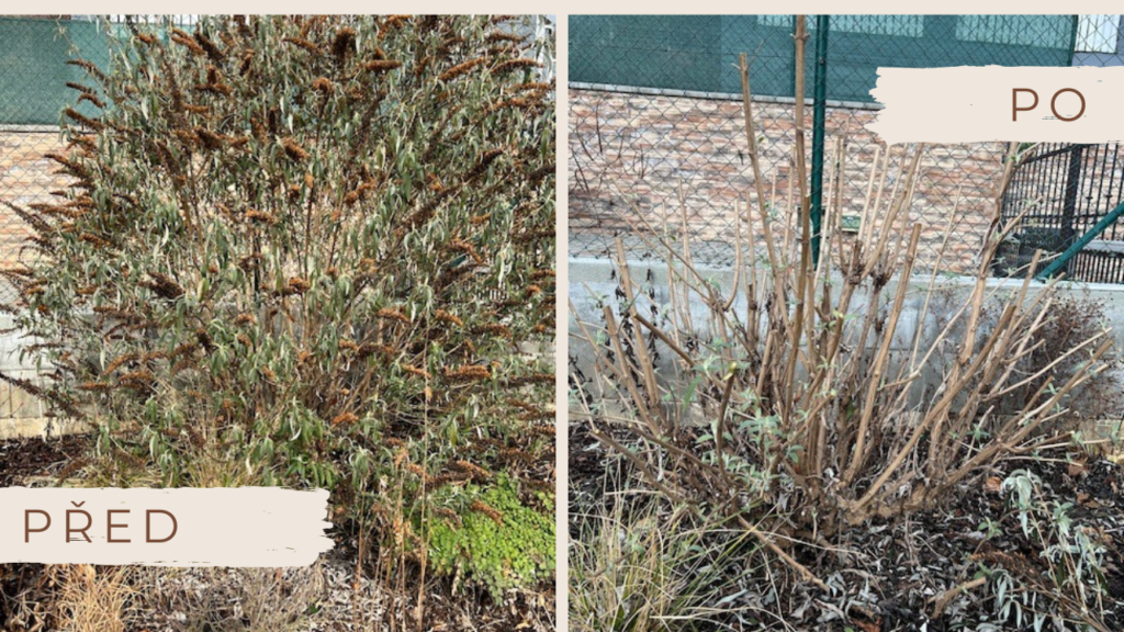 🌿 Komule Davidova (motýlí keř) – zkrátíme o 2/3, čímž podpoříme bohaté kvetení.